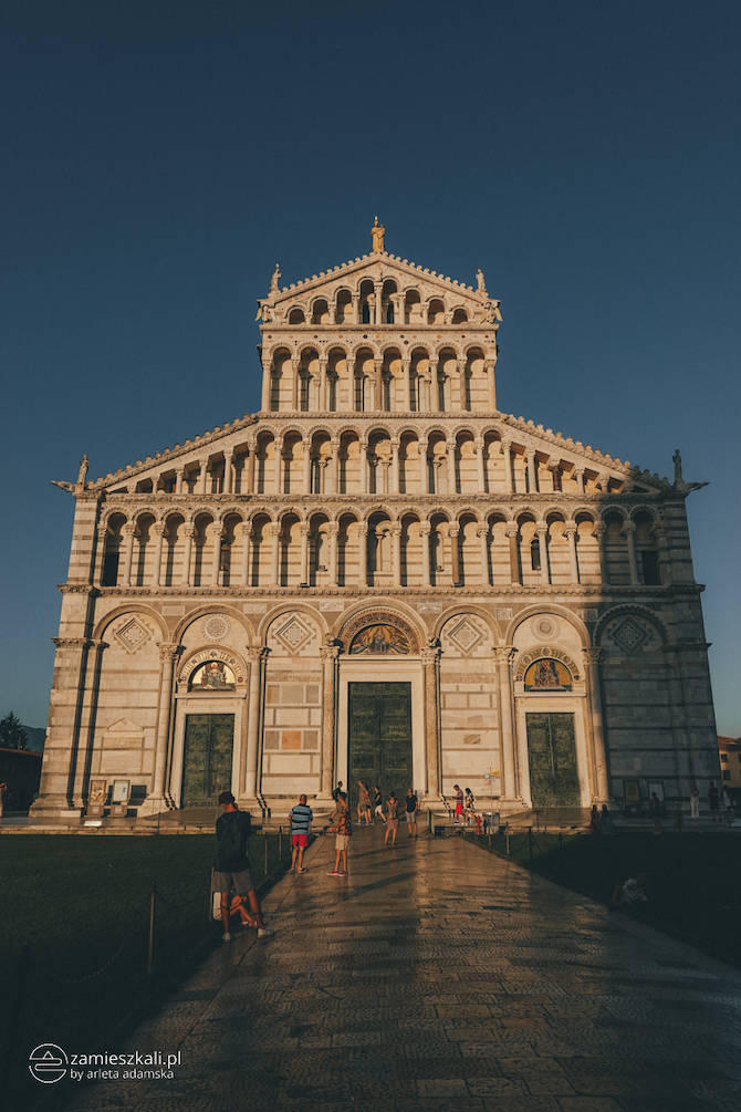 Zaryzykuję stwierdzenie, że wieżę przyćmiewa znajdująca się na placu, centralnie zlokalizowana katedra. Prawdopodobnie zaraz po tym, jak przebrniesz przez skaczących, leżących i zastygniętych w dziwnych pozycjach ludzi, trafisz pod fasadę katedry. Bardzo polecam Ci przyjrzeć się jej od strony baptysterium, drzwi prowadzące do katedry są niezwykłe. Katedra łączy w sobie elementy stylistyczne architektury lombardzko-emilijskiej, klasycznej, późnostarożytnej, bizantyńskiej, rawenneńskiej i arabskiej. To arcydzieło architektury romańskiej. W wielu miejscach do złudzenia przypomina greckie i rzymskie świątynie starożytne.